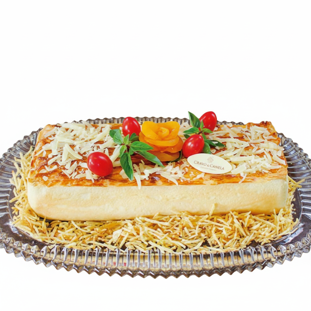 Recheio: Queijo, presunto, uvas passas, bacon, tomate e pasta de ameixa. Peça serve 10 pessoas.