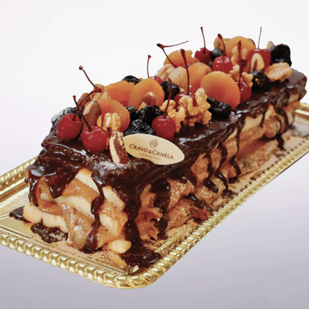 RECHEIO: Pão de ló branco, doce de leite argentino, frutas e castanhas. Contém Lactose.Peça de 1,800g, serve 10/12 pessoas.