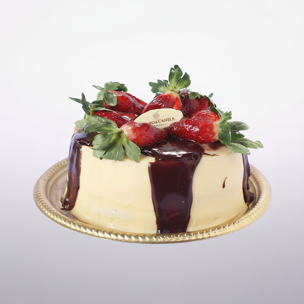 RECHEIA: Pão de ló branco, chocolate preto e branco e morangos.